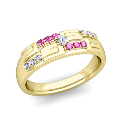 This striking wedding band features a graphic block design studded with brilliant diamonds alternating with pink sapphires to add a sparkling effect. The eye catching design makes this ring a perfect choice for men or women who are looking for an unique wedding ring. Available in 14k, 18k white, yellow or rose gold, and platinum.