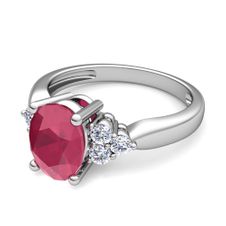 An oval shaped natural ruby sparkles in the center of a three stone ring band with fastidiously matched diamond side stones to create a dramatic presence. The ruby engagement ring gorgeously fits together with a matching diamond wedding band to make a harmonious couple. What a beautiful duet! Available in 14k, 18k white, yellow or rose gold, and platinum.