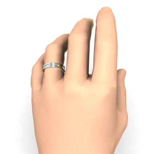 This 5mm mens wedding band showcases brilliant round diamond and yellow sapphire flush set beautifully in a comfort fit ring band. The modern yet classic design makes this ring a perfect choice as a wedding ring or anniversary ring for men and women. Available in 14k, 18k white, yellow or rose gold, and platinum.