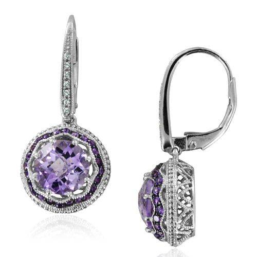 These stunning diamond and amethyst drop earrings are inspired by Art Deco fine art. Two beautiful 8x8mm rose de france amethyst are surrounded by vibrant purple round cut amethyst set in 10k white gold with milgrain details around. Gorgeous and unique earrings. Matching necklace is available.