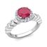 This elegant halo engagement ring showcases sparkling diamonds surround a 5mm ruby set in a 14k gold bezel set diamond ring band to complete the gorgeous look.
