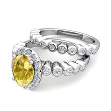 This elegant halo engagement ring showcases sparkling diamonds surround a 8x6mm oval yellow sapphire set in a 14k gold bezel set diamond ring band to complete the gorgeous look.