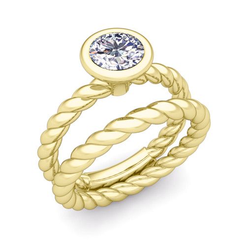 Modern and strikingly stunning, this eye-catching engagement ring showcases a round brilliant cut diamond bezel set in the center of a band of delicately entwined twisted rope band. A perfect matching twisted rope wedding band completes the contemporary look of this beautiful bridal set. Available in 14k, 18k white, yellow or rose gold, and platinum.