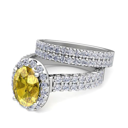 This eye-catching halo bridal set showcases a halo engagement ring of an oval shaped natural yellow sapphire surrounded by sparkling diamonds set in a two row ring band accented with round brilliant cut diamonds. A perfect match diamond wedding band completes the stunning look of this beautiful bridal set. Available in 14k, 18k white, yellow or rose gold, and platinum.