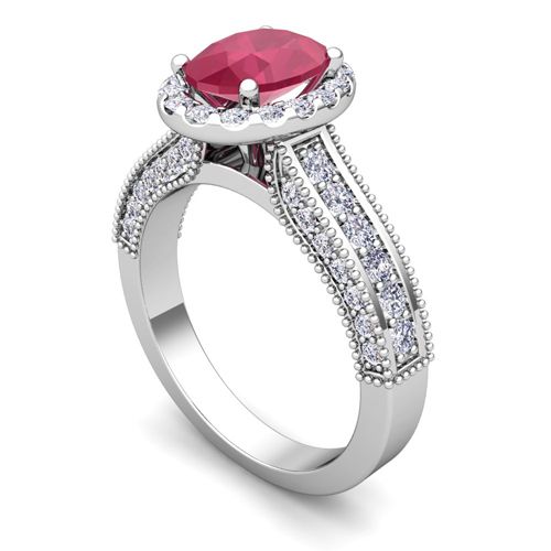 This vintage inspired bridal set showcases a heirloom engagement ring of an oval shaped natural ruby surrounded by dazzling diamonds set in a milgrained ring band accented with round brilliant cut diamonds. A perfect match diamond wedding band completes the gorgeous look of this beautiful engagement wedding ring set. Available in 14k, 18k white, yellow or rose gold, and platinum.