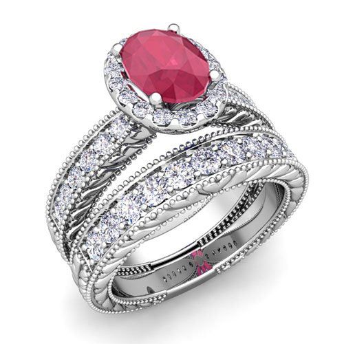 This intricate bridal set showcases a heirloom engagement ring of an oval shaped natural ruby surrounded by dazzling diamonds set in a hand engraved ring shank with milgrain detailing accented with round brilliant cut diamonds. A matching vintage inspired diamond wedding band completes the gorgeous look of this beautiful engagement wedding ring set. Available in 14k, 18k white, yellow or rose gold, and platinum.