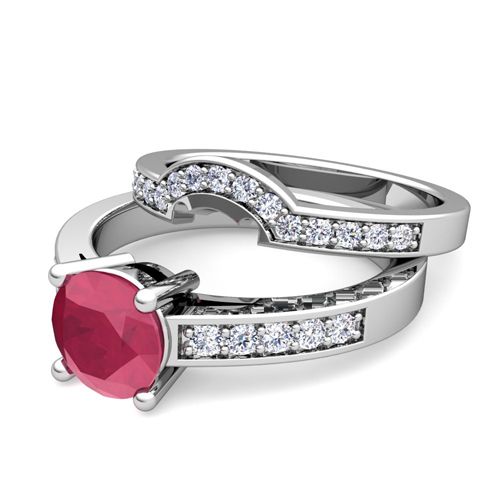 Pave Diamond and Solitaire Ruby Engagement Ring Bridal Set in Platinum, 6mm