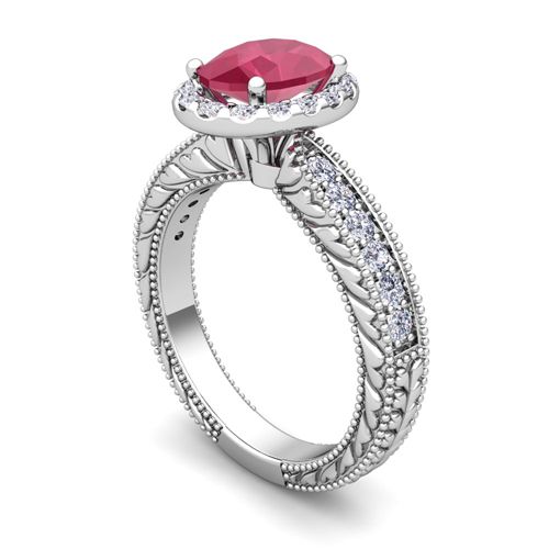 Inspired by vintage design, this platinum bridal set showcases a 9x7mm ruby heirloom engagement ring and a matching diamond wedding band to complete the gorgeous look.