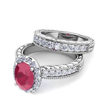 Vintage Inspired Diamond and Ruby Engagement Ring Bridal Set in Platinum, 9x7mm