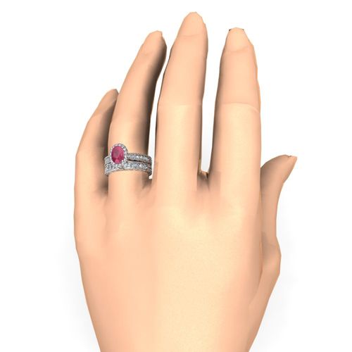 Inspired by vintage design, this platinum bridal set showcases a 8x6mm ruby heirloom engagement ring and a matching diamond wedding band to complete the gorgeous look.
