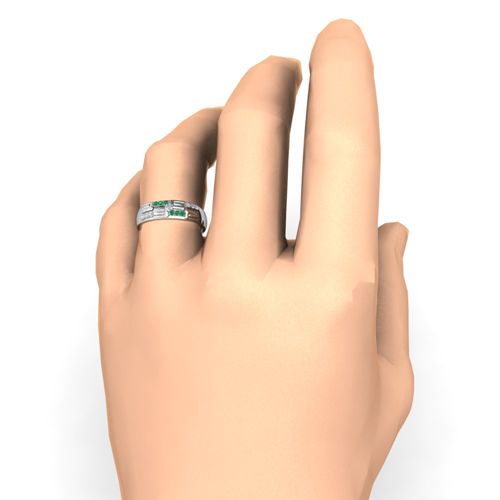 This striking wedding band features a graphic block design studded with brilliant diamonds alternating with emeralds set in a platinum ring band creating a bold and sparkling effect.