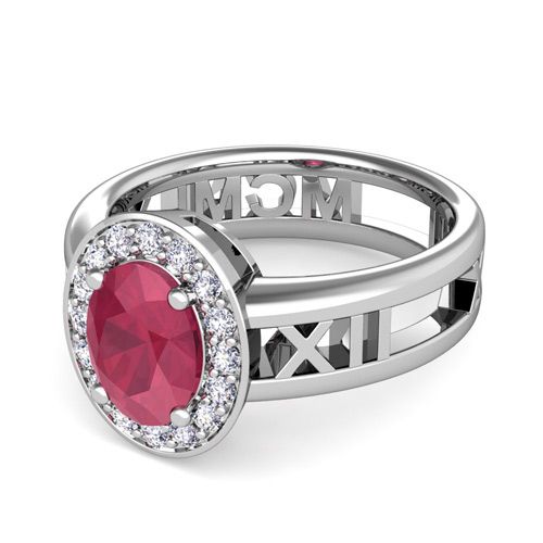 This eye-catching halo engagement ring features a 8x6mm ruby surrounded by diamonds set in a platinum roman numeral band.