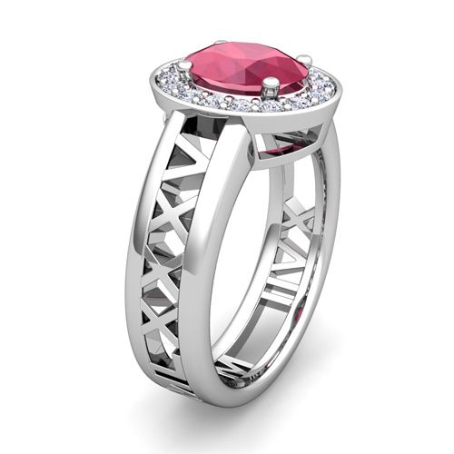 This eye-catching halo engagement ring features a 9x7mm pink sapphire surrounded by diamonds set in a platinum roman numeral band.