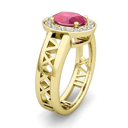 This eye-catching halo engagement ring features a 7x5mm pink sapphire surrounded by diamonds set in a 14k gold roman numeral band.