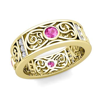 This eye catching wedding ring showcase gorgeous Celtic knots interspersed with bezel set round shape pink sapphires with sparkling round brilliant diamonds aside in a Celtic knot wedding band. Perfect design as a wedding anniversary ring for men and women who are looking for unique rings. Available in 14k, 18k white, yellow or rose gold, and platinum.
