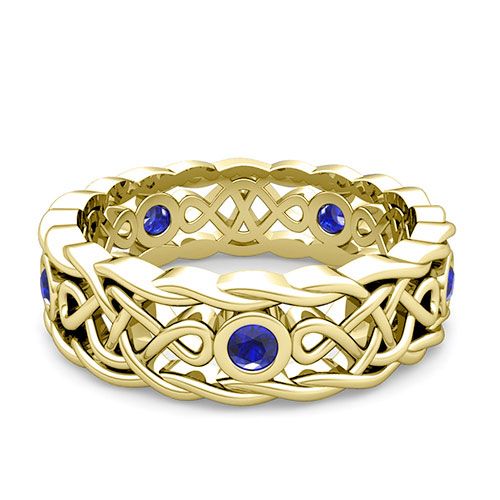 This stunning wedding ring showcase beautiful Celtic knots interspersed with bezel set round brilliant blue sapphires set in a Celtic knot wedding band. What an eye-catching and unique wedding ring for men and women. Available in 14k, 18k white, yellow or rose gold, and platinum.