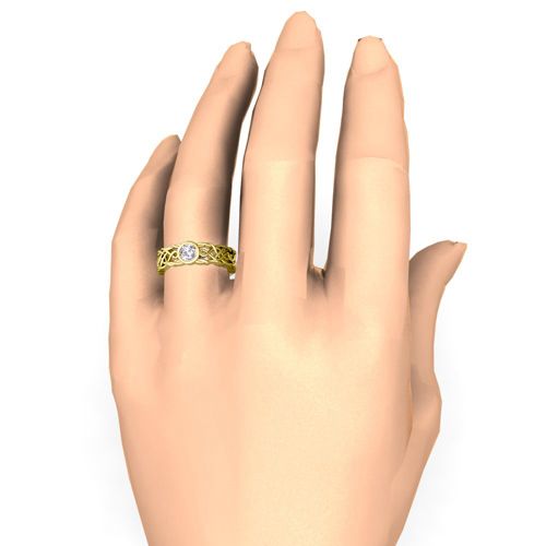This Celtic knot ring showcases a solitaire diamond bezel set in a 14k gold ring band. The symbolic and romantic design makes it perfect as a wedding ring or engagement ring.