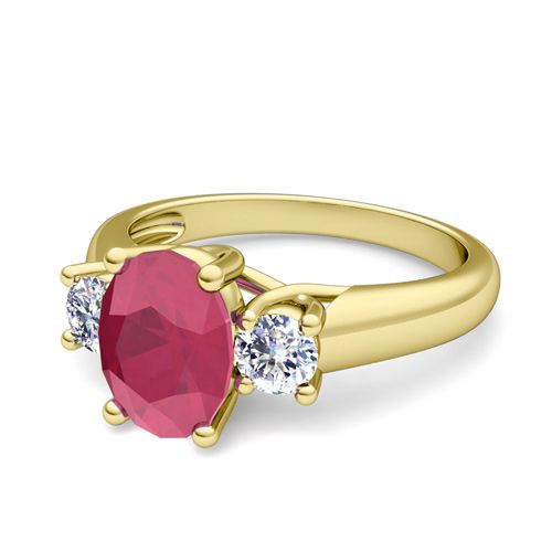 Classic Diamond and Ruby Three Stone Ring in 14k Gold, 7x5mm