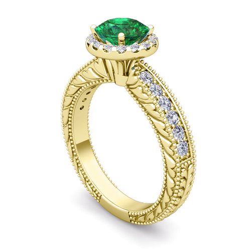 Inspired by vintage design, this 14k gold bridal set showcases a 6mm emerald heirloom engagement ring and a matching diamond wedding band to complete the gorgeous look.
