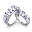 This exquisite platinum matching wedding ring set showcases beautiful plaids across the top of his and hers wedding rings highlighted with sparkling diamonds and blue sapphires.
