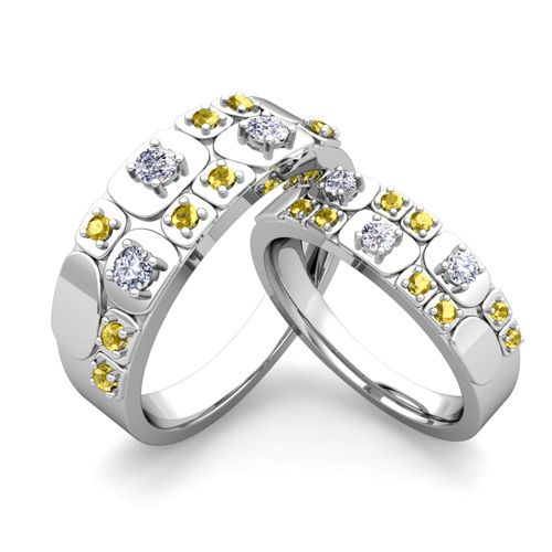 This exquisite platinum matching wedding ring set showcases beautiful plaids across the top of his and hers wedding rings highlighted with sparkling diamonds and yellow sapphires.