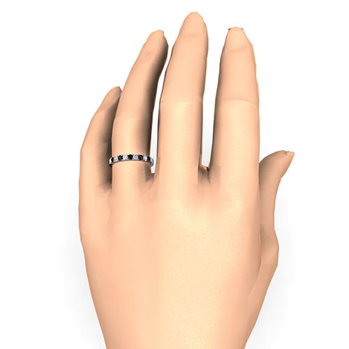 This wedding ring features sparkling black and white diamonds set in an enduring platinum band. Delicate in design, perfect as a wedding band or anniversary ring.