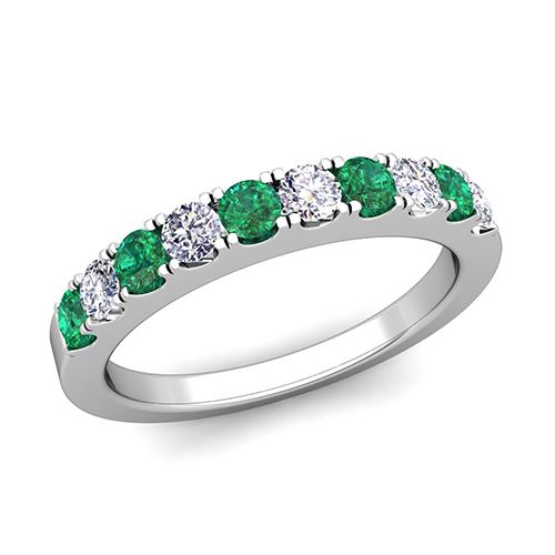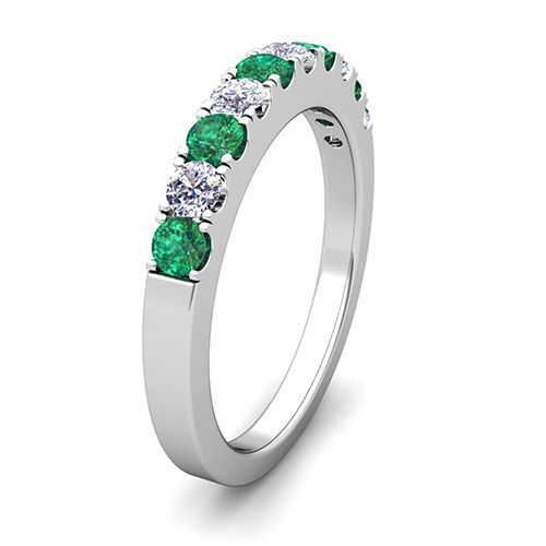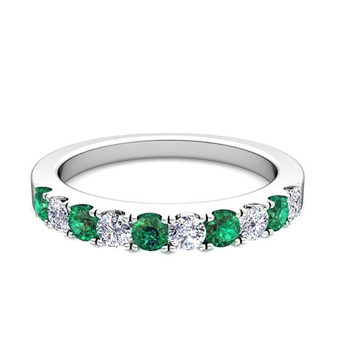 This wedding ring features sparkling diamonds and emeralds set in an enduring platinum band. Delicate in design, perfect as a wedding band or anniversary ring.