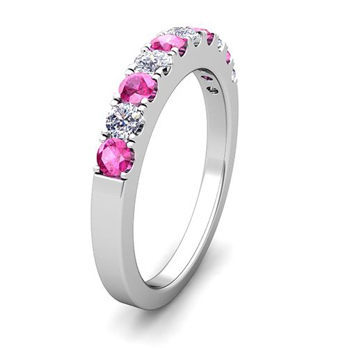 This wedding ring features sparkling diamonds and pink sapphires set in an enduring platinum band. Delicate in design, perfect as a wedding band or anniversary ring.