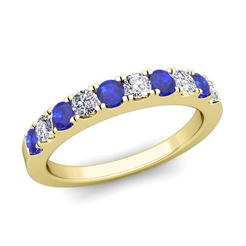 This wedding ring features sparkling diamonds and blue sapphires set in an enduring 14k gold band. Delicate in design, perfect as a wedding band or anniversary ring.