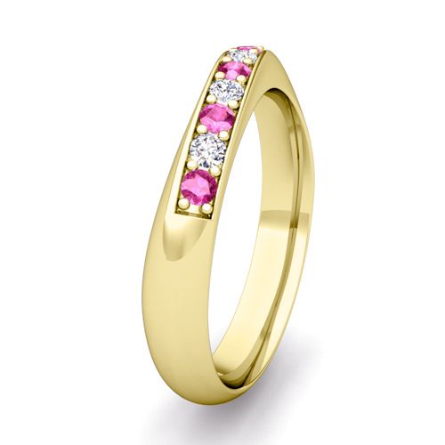 This 18k gold curved wedding band showcases brilliant diamonds alternating with vibrant pink sapphires to add a sparkling effect. Perfect wedding ring for men and women.