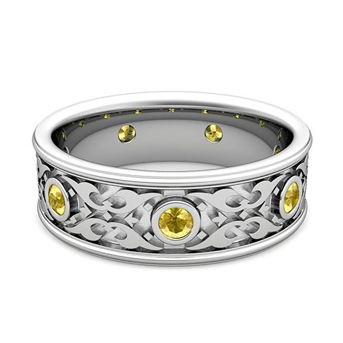 This stunning Celtic wedding ring for men features round shape yellow sapphires bezel set gorgeously on the platinum carved Celtic knot band.