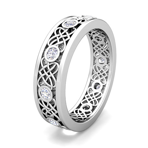 This eye-catching Celtic wedding ring showcases intricate Celtic Heart Knots interspersed beautifully with bezel set diamonds set in a platinum band.