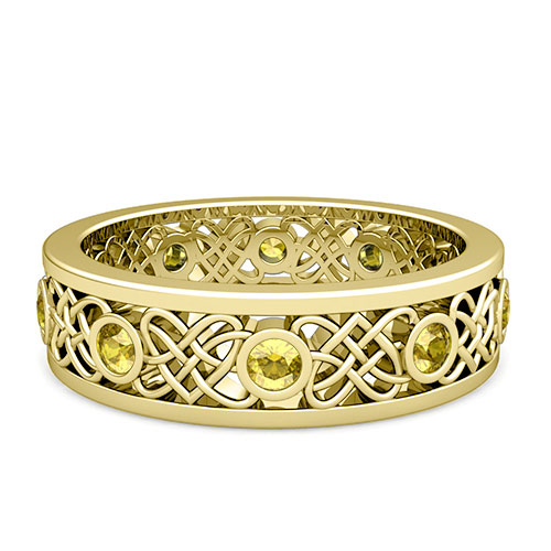 This eye-catching Celtic wedding ring showcases intricate Celtic Heart Knots interspersed beautifully with bezel set yellow sapphires set in a 14k gold band.