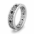 This eye-catching Celtic wedding ring showcases intricate Celtic Heart Knots interspersed beautifully with bezel set black diamonds set in a platinum band.