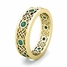 This eye-catching Celtic wedding ring showcases intricate Celtic Heart Knots interspersed beautifully with bezel set emeralds set in a 18k gold band.