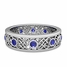 This eye-catching Celtic wedding ring showcases intricate Celtic Heart Knots interspersed beautifully with bezel set blue sapphires set in a platinum band.