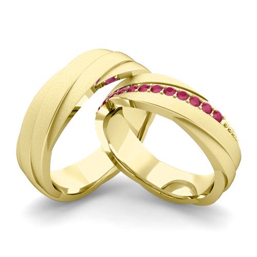 This 14k gold matching wedding ring set showcases vibrant red rubies set in her ring and a rolling wedding band with brushed finish as his ring. Elegant couples rings for celebrating love!