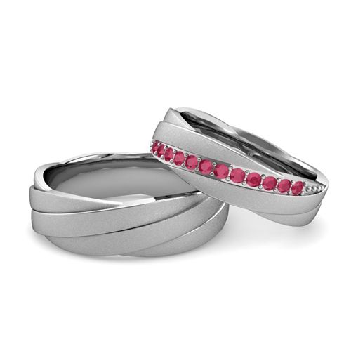 This platinum matching wedding ring set showcases vibrant red rubies set in her ring and a rolling wedding band with shiny finish as his ring. Elegant couples rings for celebrating love!