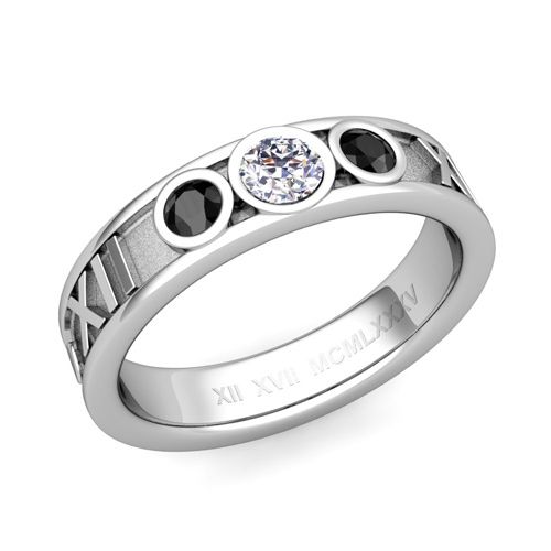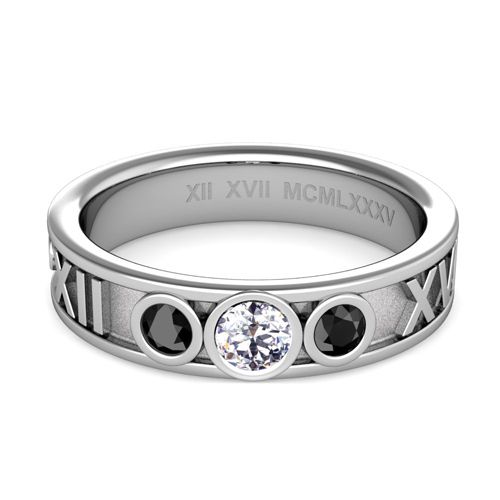 This 5mm roman numeral ring features alternating black and white diamonds set in a platinum 3 stone ring setting with your special date converted to Roman numerals.