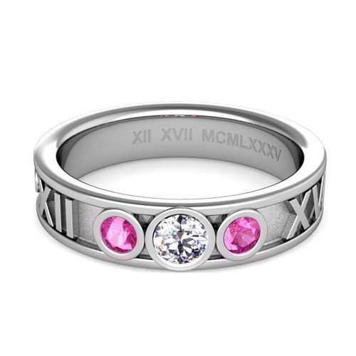 This 5mm roman numeral ring features alternating diamond and pink sapphires set in a platinum 3 stone ring setting with your special date converted to Roman numerals.
