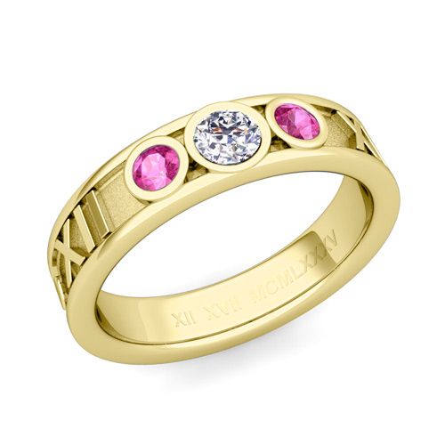 This 5mm roman numeral ring features alternating diamond and pink sapphires set in a 14k gold 3 stone ring setting with your special date converted to Roman numerals.