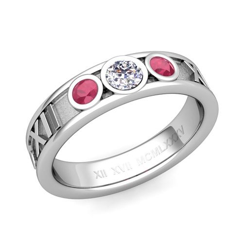 This 5mm roman numeral ring features alternating diamond and rubies set in a platinum 3 stone ring setting with your special date converted to Roman numerals.