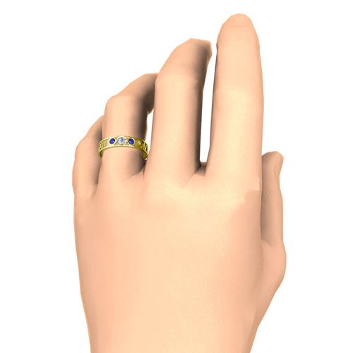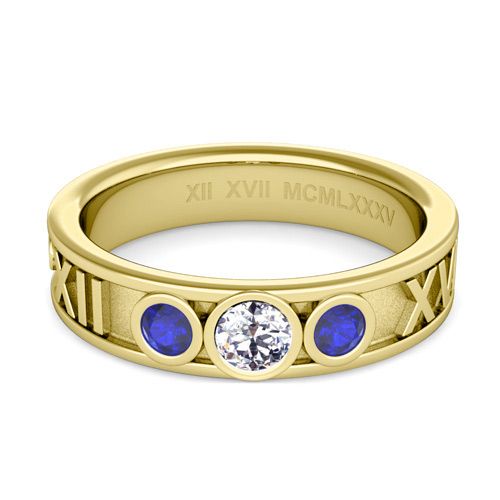 This 5mm roman numeral ring features alternating diamond and blue sapphires set in a 14k gold 3 stone ring setting with your special date converted to Roman numerals.