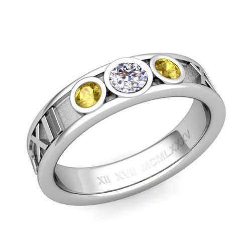 This 5mm roman numeral ring features alternating diamond and yellow sapphires set in a platinum 3 stone ring setting with your special date converted to Roman numerals.