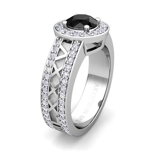 This breathtaking roman numeral engagement ring showcases a 6mm black diamond surrounded by sparkling diamonds set in a platinum halo setting