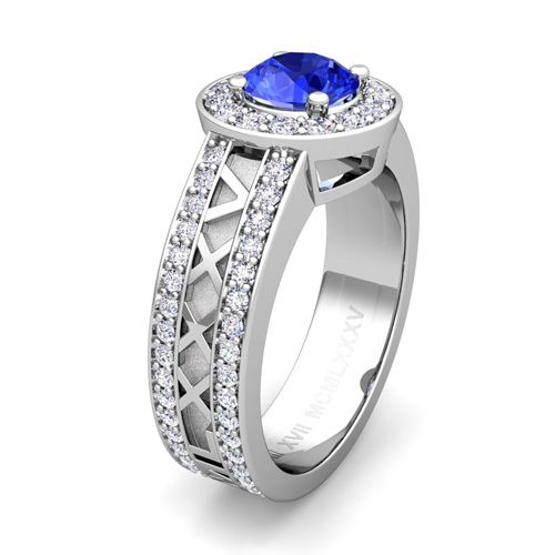 Create roman numeral engagement ring set in 14k, 18k gold or platinum halo setting of your choice of diamond or gemstone with your special date.