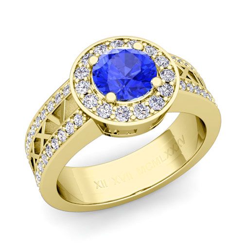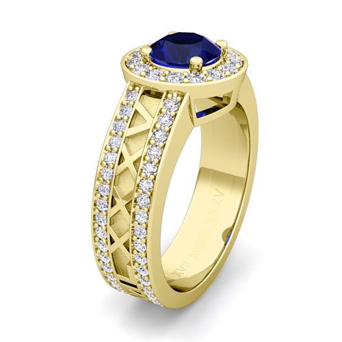 This breathtaking roman numeral engagement ring showcases a 5mm blue sapphire surrounded by sparkling diamonds set in a 14k gold halo setting
