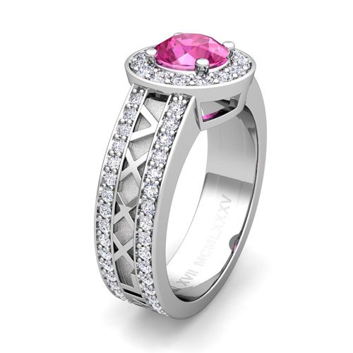 This breathtaking roman numeral engagement ring showcases a 6mm pink sapphire surrounded by sparkling diamonds set in a platinum halo setting