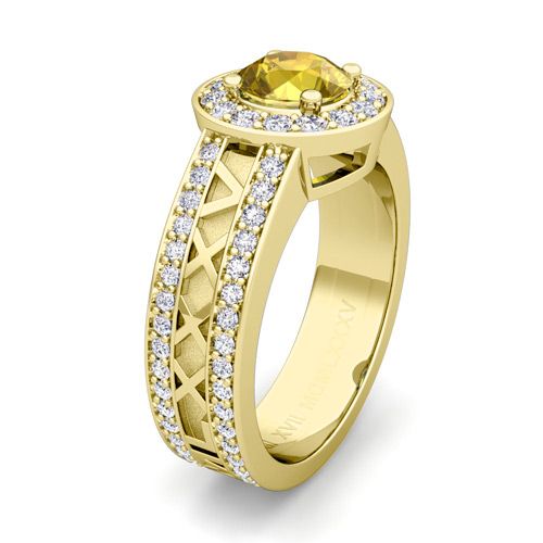 This breathtaking roman numeral engagement ring showcases a 7mm yellow sapphire surrounded by sparkling diamonds set in a 14k gold halo setting