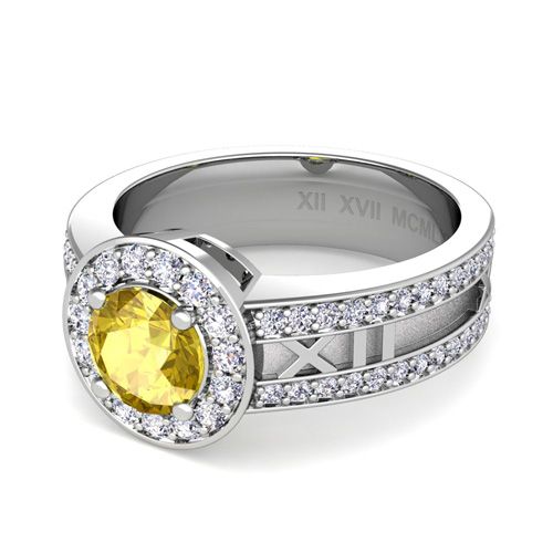 This breathtaking roman numeral engagement ring showcases a 6mm yellow sapphire surrounded by sparkling diamonds set in a platinum halo setting